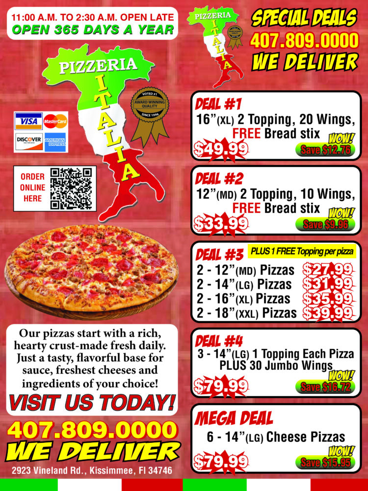 Pizzeria Italia Short Description Pizzeria Description Pizzeria Phone 407-809-0000 Address 2923 Vineland Rd. Kissimmee, FL ZIP Code 34746