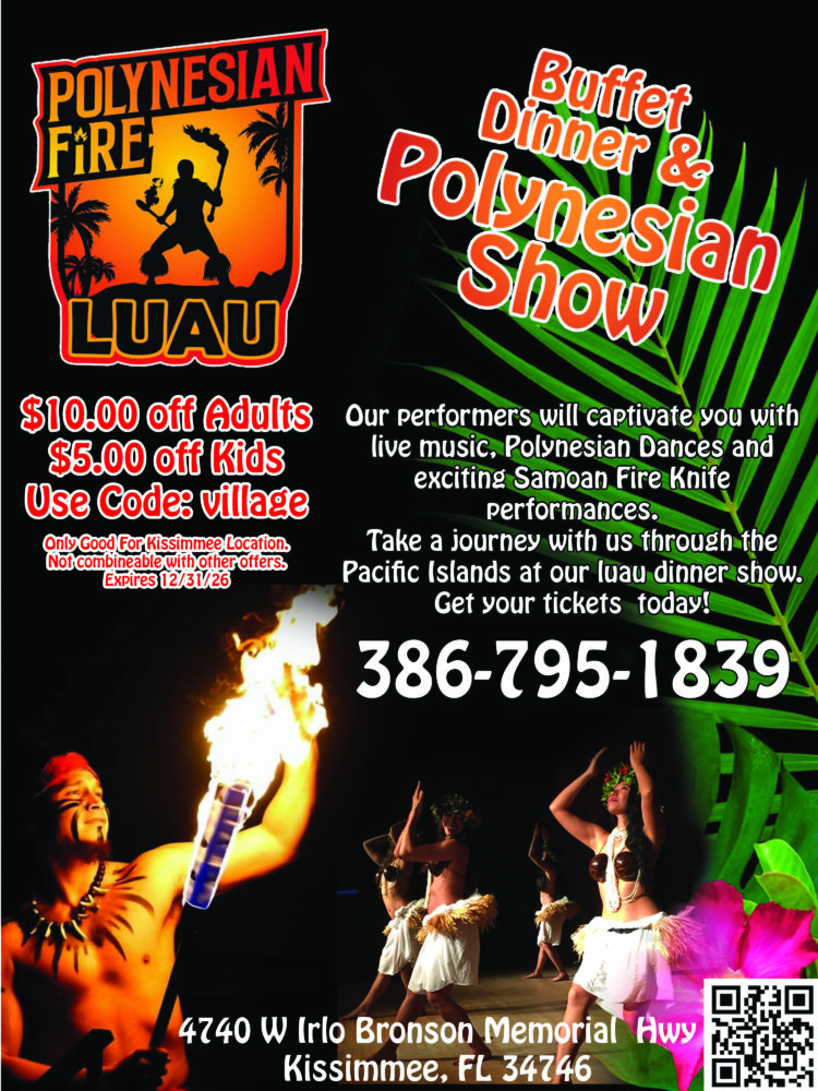 Polynesian Fire & Luau Dinner Show Listing Category AREA OF ATTRACTIONS Description Polynesian Fire & Luau Dinner Show Website https://www.polynesianfire.com/ Phone 843-424-1978 Address 4740 W Irlo Bronson Memorial Hwy, Kissimmee, FL ZIP Code 34746