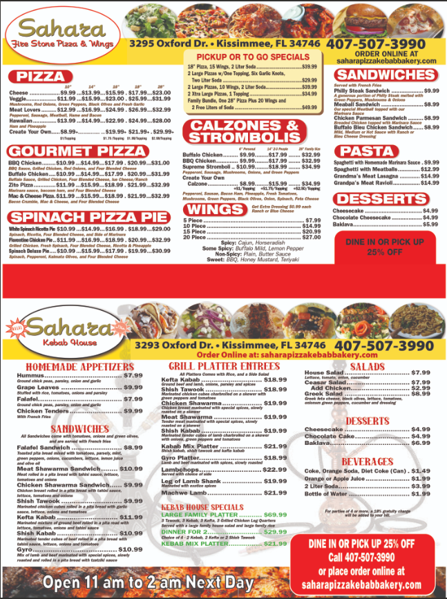 Sahaza Listing Category RESTAURANTS Description Fire Stone Pizza & Wings Kebab House Website https://saharapizzakebabbakery.com Phone 407-507-3990 Address 3293 Oxford Dr. Kissimmee, FL ZIP Code 34746