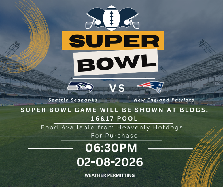 Super Bowl game will be shown at bldgs. 16&17 pool.